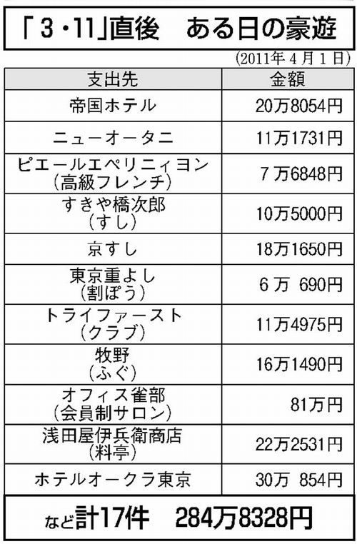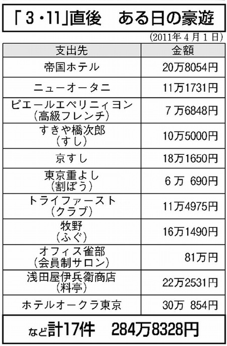 東日本大震災直後の同年4月1日にも、ミシュラン三つ星常連の銀座の超高級すし店や、高級フレンチなど17店に約285万円の支出がありました。