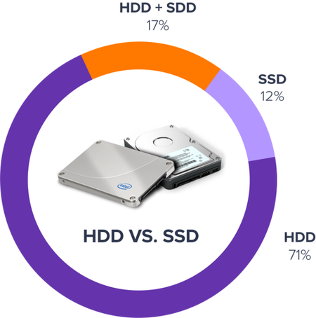 ストレージについては、HDDのみの構成が71%と圧倒的。HDDとSSDの併用が17%、SSDが12%と続く。