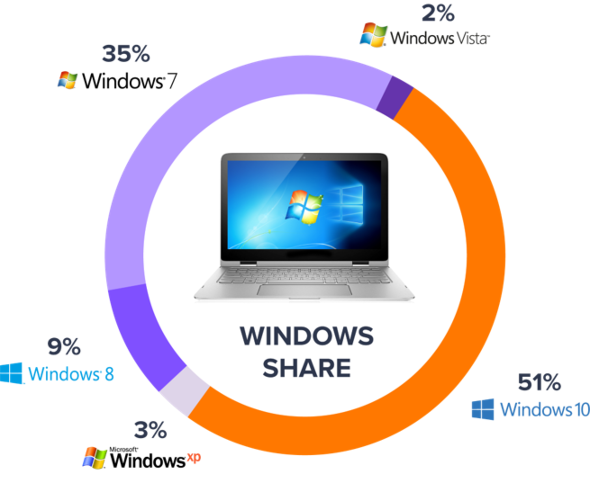 最も多いのがWindows 10で、51%。次いでWindows 7が35%、Windows 8が9%、Windows XPが3%、Windows Vistaが2%という結果になった。
