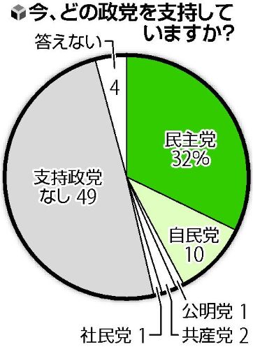 支持政党 政党の支持率は、トップの民主が32%。次いで自民10%、共産2%、公明、社民が各1%。