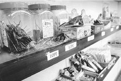 棚に並ぶのは、小さなチョコレート菓子やガム、昔ながらのふ菓子など数十円の菓子がほとんど。子どもにとってささやかな楽しみです。店内で、もんじゃ焼きをわずか150円(子どもサイズ。毎月9日は憲法9条にちなみ90円)で食べられるのも人気です。
