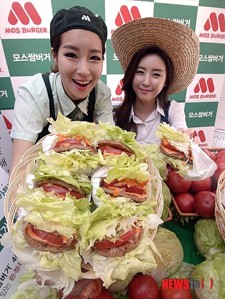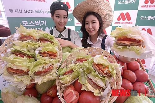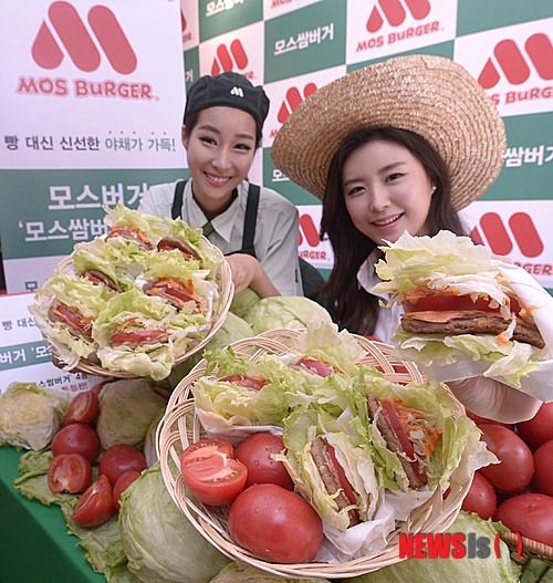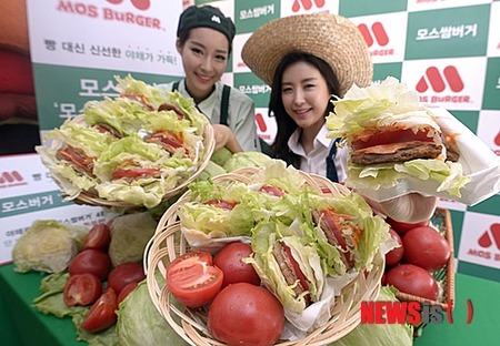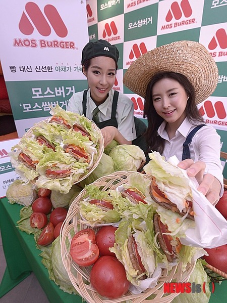 ソウル市鍾路区のモスバーガー明洞中央店で27日午前、モデルたちが限定発売の異色バーガー「モス・サム・バーガー」4種をPRした。