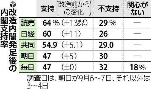 【メディア】各社世論調査の内閣支持率、選択肢で差 読売、日経は上昇 「関心なし」項目ある毎日は横這い | 毎日新聞 [9/5]