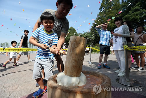 秋夕(中秋節、今年は9月8日)を翌日に控えた7日、ソウル・オリニ(子ども)大公園で開催された餅つき体験行事に参加した親子。