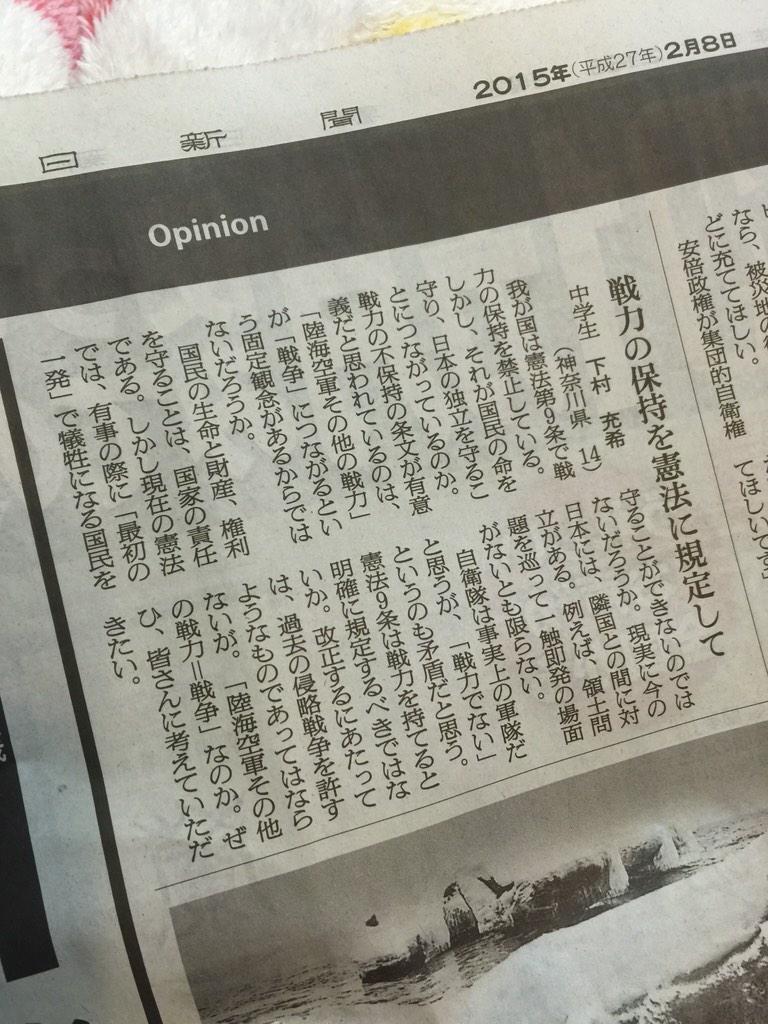 でもこの隣が「9条に守られてる」中学生の投書だった気が