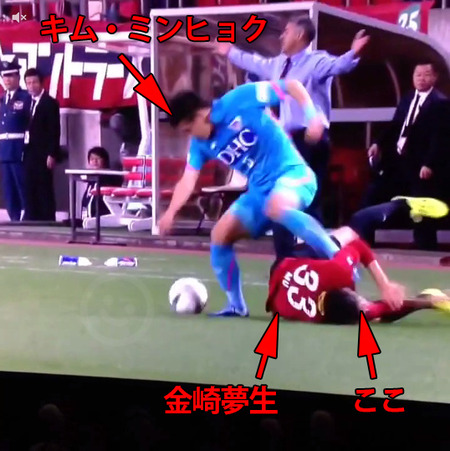 金崎選手の顔面を踏みつけるラフプレーを行い問題となっている。