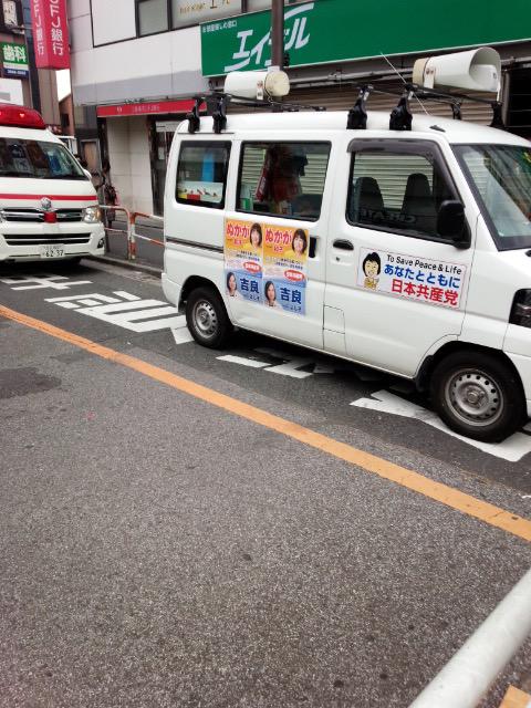 緊急車両スペースに、救急車がきたが、共産党の街頭車が停まり前に進めず。