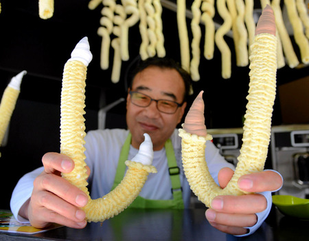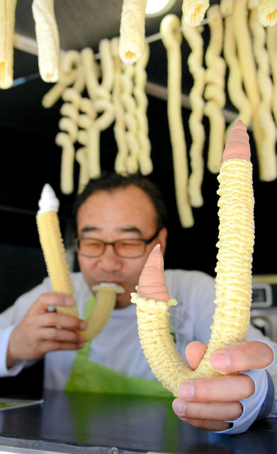 杖の持ち手を逆さにしたような妙な形の食べ物。思い切ってかぶりつくと、あれ、冷たくて甘い? 実はこれ、大阪・心斎橋で人気上昇中の韓国発アイス。