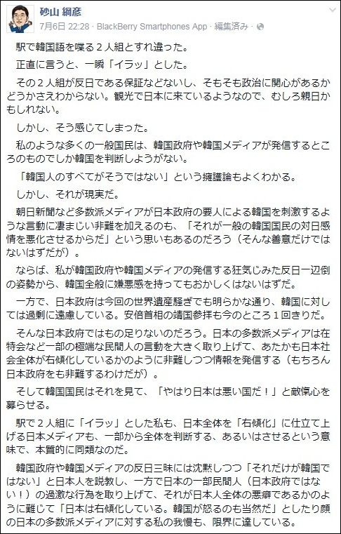 騒動の発端となったのは、産経新聞の砂山綱彦氏のFacebookへの投稿内容だった。「駅で韓国語を喋る2人組とすれ違った。