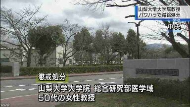 山梨大学大学院の女性教授が、部下の助教に対し、感情的な叱責を繰り返したり、流産したあと退職を促す発言をしたりするなど、いわゆる「パワーハラスメント」を行ったとして、大学はこの教授を減給の懲戒処分としました。