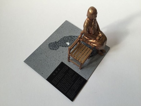 「座る女性」像の横のイスは、自分も座って記念撮影するための物?