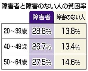 貧困状態にあることが山田篤裕・慶応大教授らの研究グループの調査で分かった。障害のない人の数値に比べほぼ二倍だった。