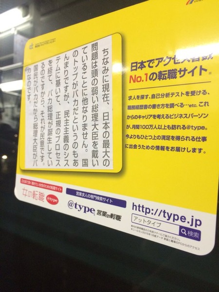 >電車のドア広告に反安倍シールをペタッ! この手があったか