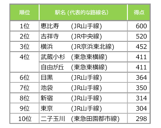 吉祥寺は調査開始以来、4年連続の1位から2位へと順位を落とし、80点差で恵比寿が1位となった。 以下、横浜(3位)、武蔵小杉、自由が丘(同率4位)、目黒、池袋、新宿と続く。