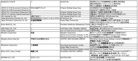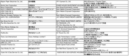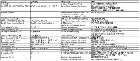 電通、JAL、オリックス、バンダイ、ドワンゴ、大日本印刷、ダイソー、セコム、 楽天、東京海上、丸紅、日本製紙、ソニー、ユニクロ、日本郵船、やずや、大和証券、ドリームインキュベータ、ジャフコ、石油資源開発、三菱商事、商船三井、双日