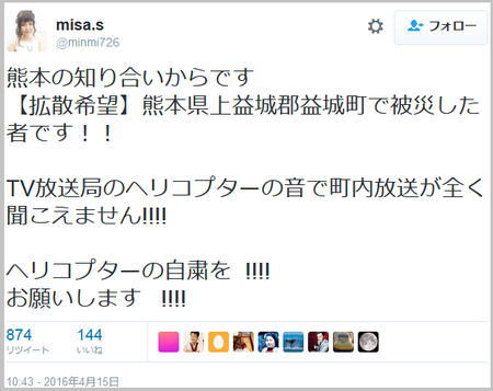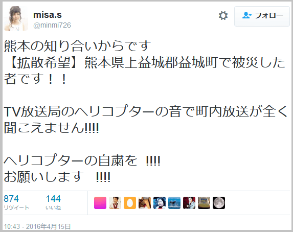 かつて阪神淡路大震災のときにも起きたトラブルが熊本地震でも起きた。被災者には避難場所や救援物資の配布場所を告知したいのに、ヘリが低空飛行で現場の状況がより分かりやすい映像を撮ろうとするものだからうるさくてかなわない。