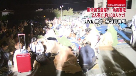 被災者が集まっている様子を撮影するには辺りが暗いのでライトを照らしたのだろう。寝ている子供もいるのに迷惑極まりない。眩しい光から逃れようとライトに背を向け頭を低くする人が多くみられた。
