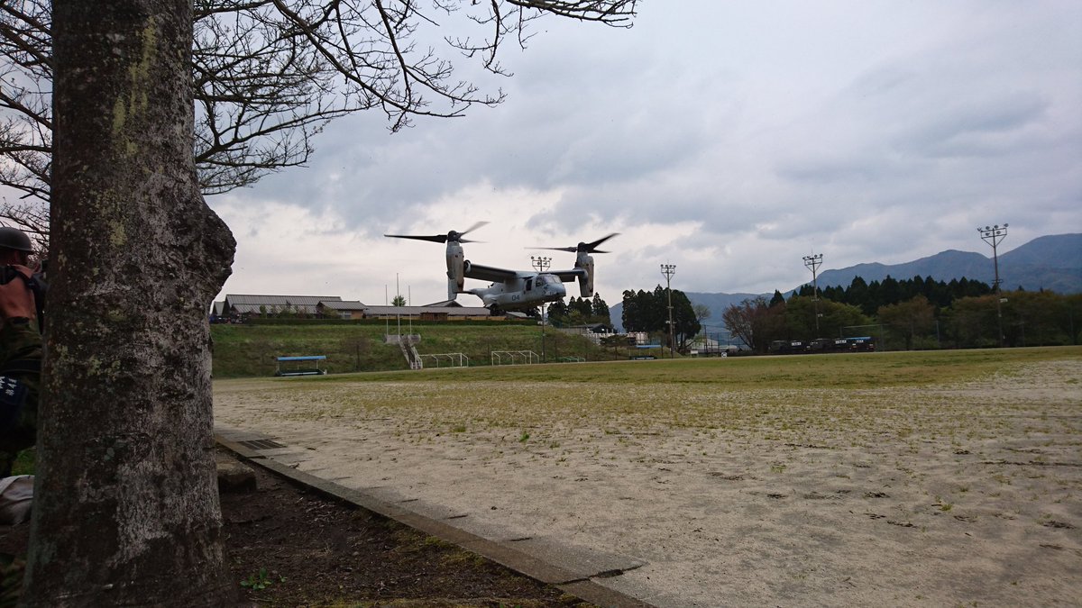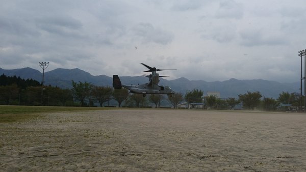 @_vamochan はじめましてです。地震で大変なのに画像アップしてくれてありがとうございます。私も、間近でオスプレイ見てみたいです。米兵はカッコ良かったですか?