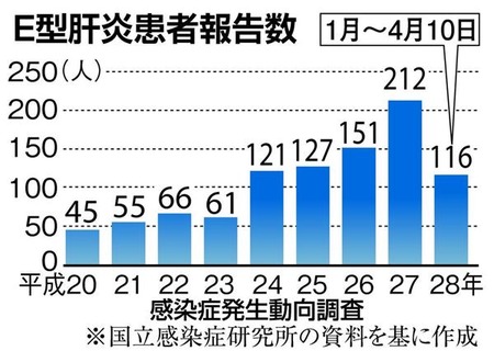 国立感染症研究所によると、今年1月から4月10日までのE型肝炎患者数は116人で、前年同期の2・2倍に上る。都道府県別でみると、最も多いのが北海道で31人、次いで東京都16人▽神奈川県9人▽埼玉県8人▽千葉県6人−と、主に北海道と首都圏に集中している。