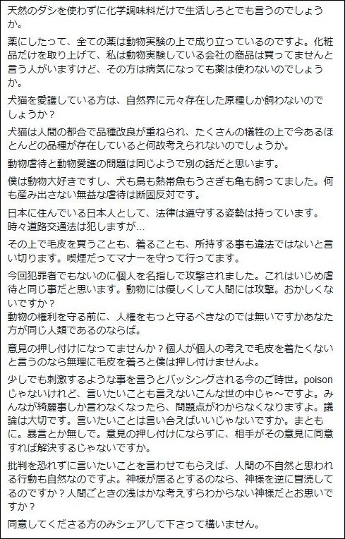 行ってきたことをなぜ否定するのかと、網野氏は反論した。そして、画像に写っているコートはフェイクファーであることも