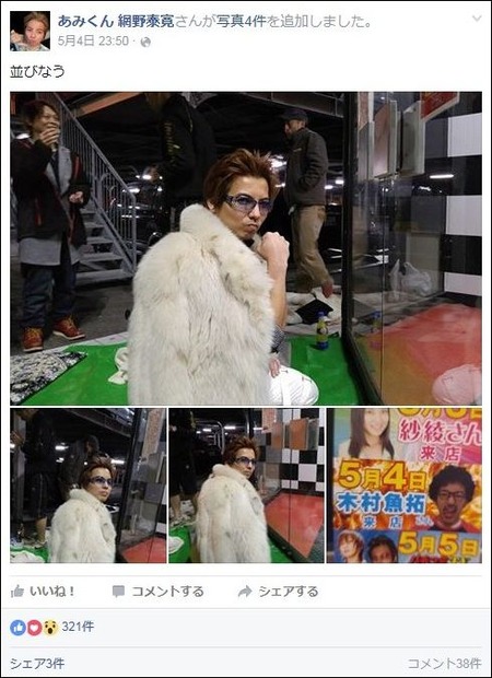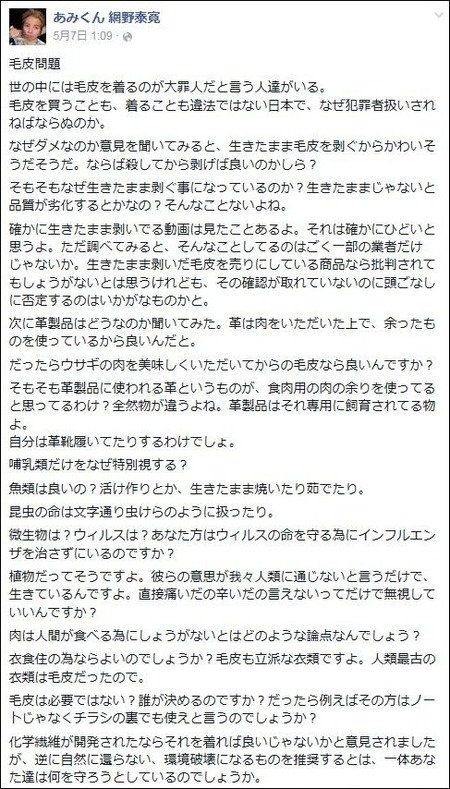 毛皮のコートを着て撮影した画像をFacebookに公開した。