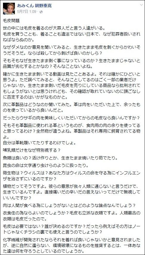 毛皮製品に反対するという人物が、上記の画像を見て網野氏を批判した。すると、毛皮は洋服の起源であり、昔から人間が