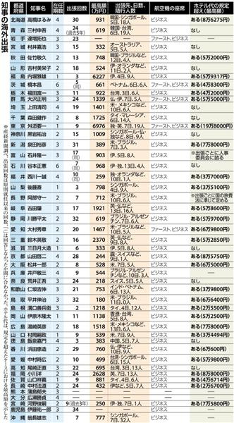 これによると、就任以降の海外出張の回数が最も多かったのは鹿児島県知事(3期)で34回。最も少なかったのは島根県知事(同)の2回だった。