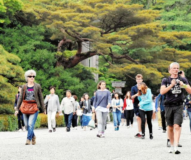 内宮の神域を歩く外国人旅行者たち=三重県伊勢市の伊勢神宮