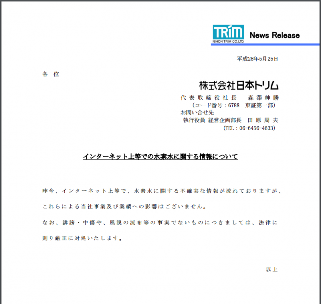 インターネット上に水素水に関する不確実な情報が流れているとして、