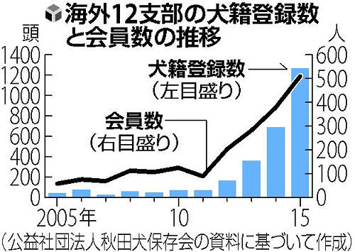 公益社団法人「秋田犬保存会」(秋田県大館市)によると、12ある海外支部の会員総数は昨年が510人で、ここ10年間で8倍以上に急増。