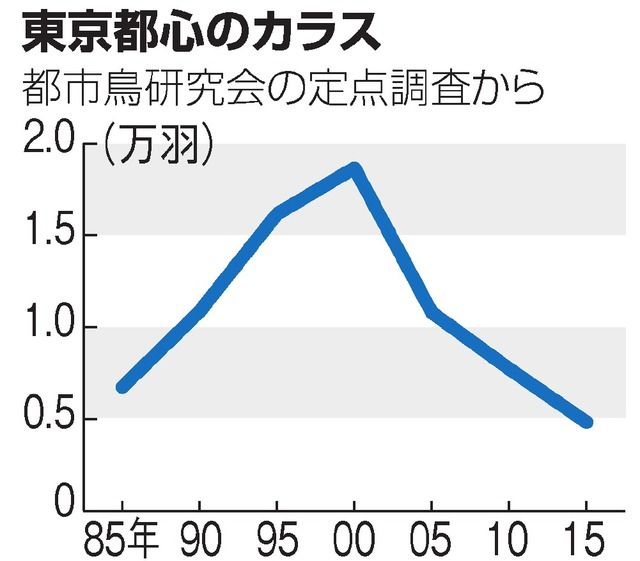 研究者らでつくる「都市鳥(としちょう)研究会」の定点観測でわかった。エサになる生ごみ対策や、都による捕獲、天敵増加などの結果だとみられるという。