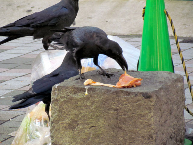 ごみ置き場で肉片を食べるハシブトガラス。最近はごみ対策が進み、こうした光景はあまり見なくなった