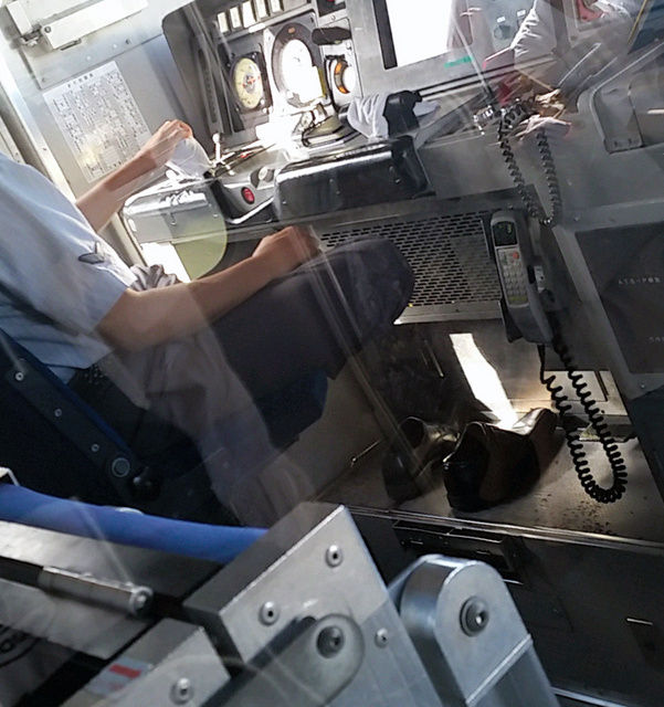 乗客が撮影した運転席の写真。運転士は靴を脱ぎ、あぐらをかいているように見える