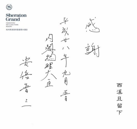 期間中、安倍首相が泊まったのが高級ホテルのシェラトン杭州湿地公園リゾートです。首相が帰国した後、1通のメッセージが話題なりました。