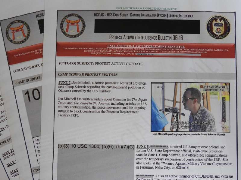【ジョン・ミッチェル特約通信員】在沖米海兵隊が名護市辺野古の新基地建設に対する抗議行動参加者などの個人情報を収集し、内部で共有していることが情報公開請求で入手した文書で分かった。