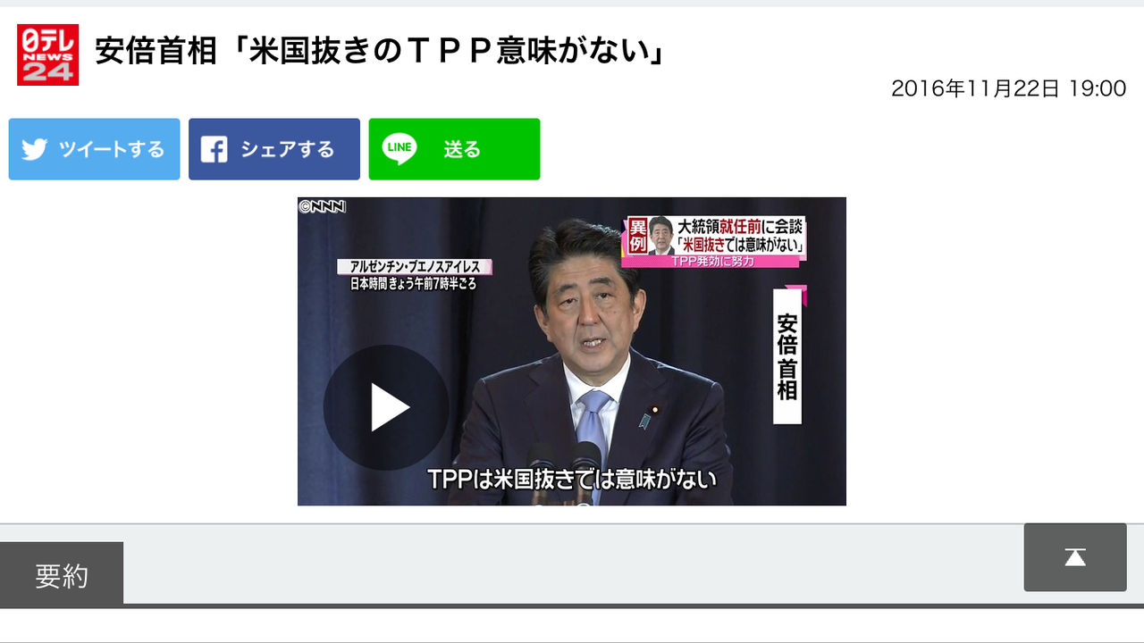 首相は19日にペルーで開かれたTPP参加12カ国による首脳会合で、全首脳が「挑戦をやり遂げる決