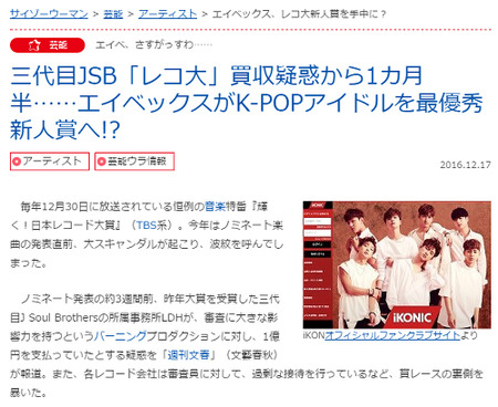 普通に新人賞を受賞したのなら問題無いのだが、実はサイゾーが12月17日に“三代目JSB「レコ大」買収疑惑から1カ月半……