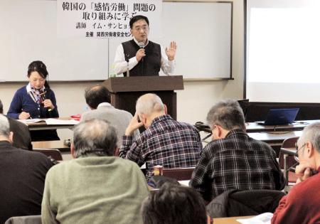 感情労働を巡る韓国の事例を紹介した集会=大阪市