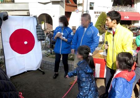 自民党推薦候補として出馬表明した与謝野信(まこと)氏(41)が、国旗に酷似した的を使った的当てゲームに関わり、黙認したとされるもので、目撃者は