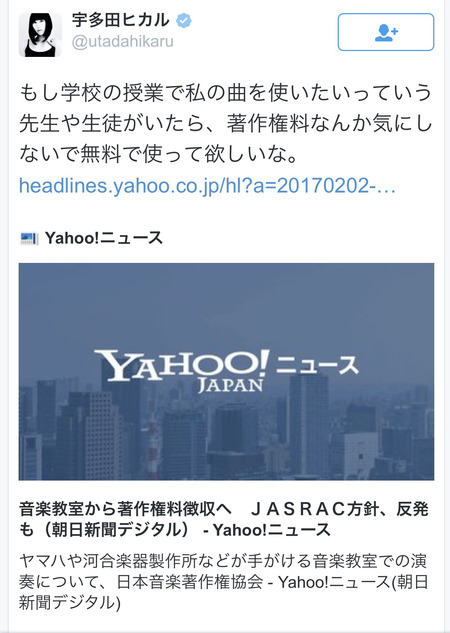 歌手の宇多田ヒカル(33)が4日、自身のツイッターを更新し、日本音楽著作権協会(JASRAC)の音楽教室に対する使用料請求問題について言及。