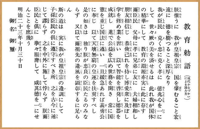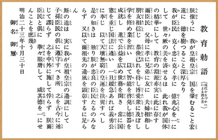 → 愛国心の醸成。国家観を確立。 教育勅語素読・解釈による日本人精神の育成(全教科の要)。道徳心を育て、教養人を育成。