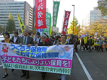 持ち寄られ、とても楽しい、保育関係者らしいパレードで、「子どもに平和を!」