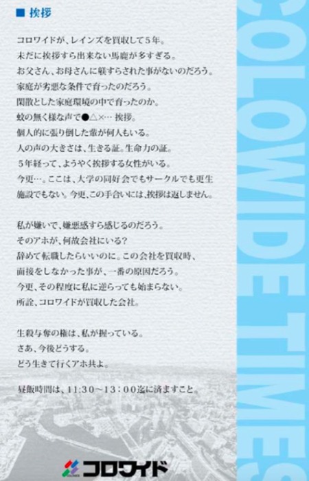 「このたび、弊社社内報の一部がSNS等において拡散されておりますが、この件に関し全体の内容につきまして複数のお問い合わせを頂いておりますことから、当該文の全文をここに掲載させて頂きます。