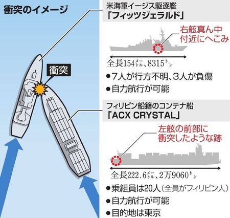 水上交通ルール素人だが、両方の損傷から推測するにイメージは車で例えたら高速の三車線道路左側後方がイージスでこれが右斜め中央を進行中の貨物船の前に出る形で追い越しをかけ三車線の右側の追い越し車線に出ようとして接触事故を起こしたような損傷だね
