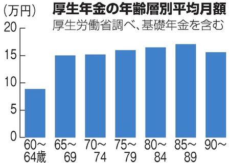 厚生年金の平均月額は60代後半が約15万円で、80代後半は約17万円――。厚生労働省は厚生年金の年齢層別の受給額を初めてまとめ、28日の社会保障審議会(厚労相の諮問機関)の部会に示した。今年4月1日時点で71歳以上の人は年金がより多くなる計算方式が使われていて、若くなるほど減る傾向にある。
