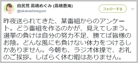 自民党の高橋めぐみ議員は7月5日、某番組から信じられないような偏向アンケートが送られてきたとFacebookとTwitterに写真をアップした。