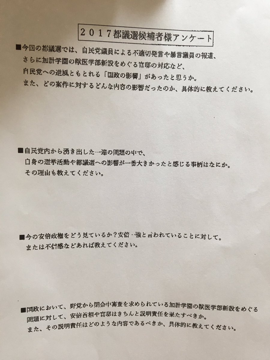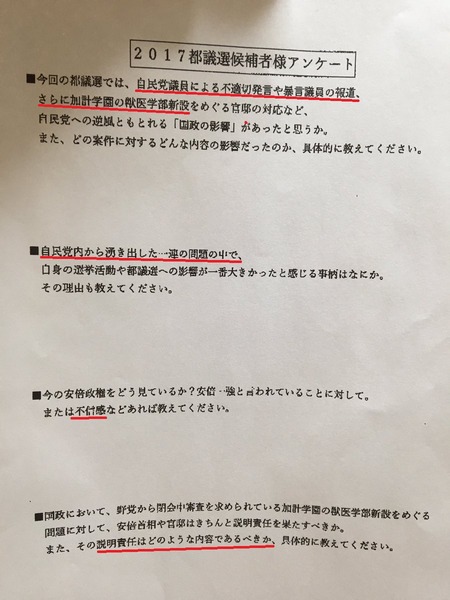 アンケートは自民党の都議選候補者を対象としたもので驚くほど結論ありきの誘導尋問が繰り広げられている。