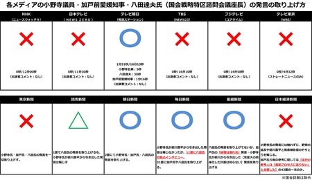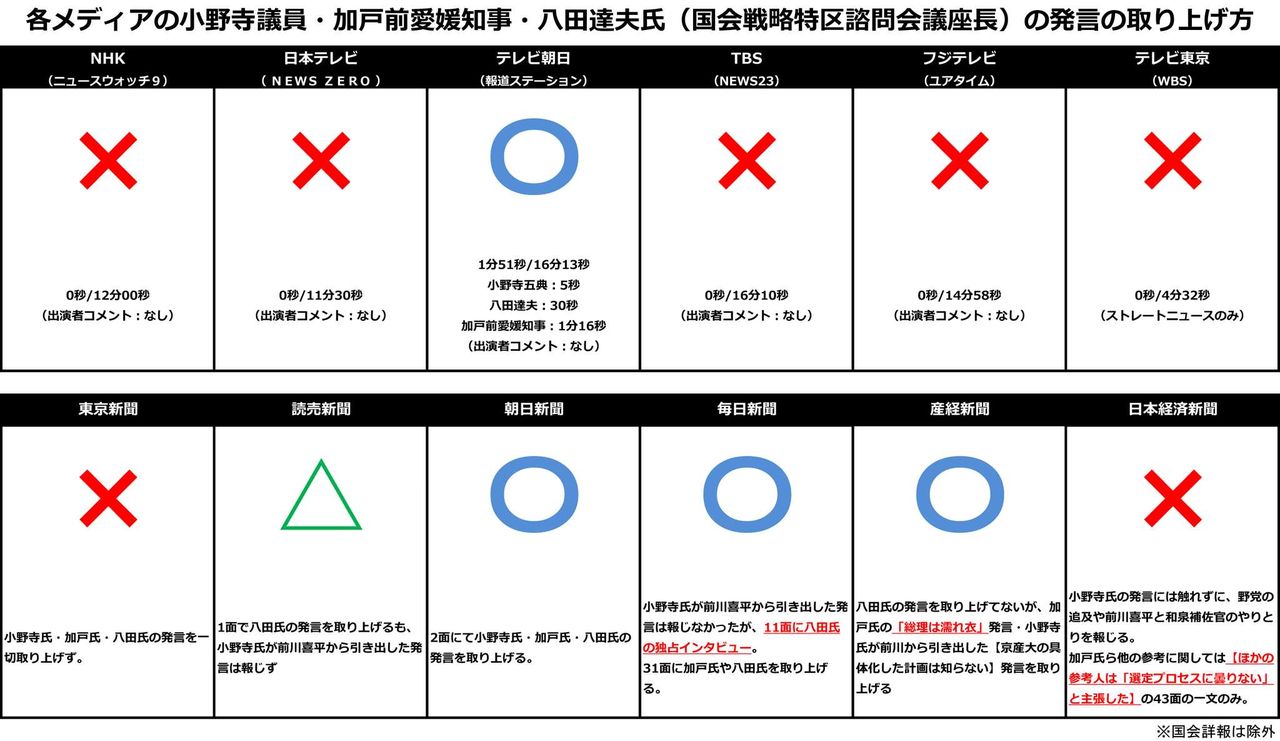 各メディアの小野寺議員・加戸前愛媛知事・八田達夫氏の発言の取り上げ方を比較しました。