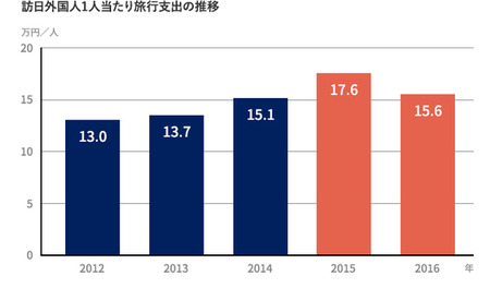 しかし、訪日外国人客1人当たりの旅行支出は15万5,896円と、前年に比べ11.5%減っているのだ。背景には中国人による“爆買い”の失速が考えられる。