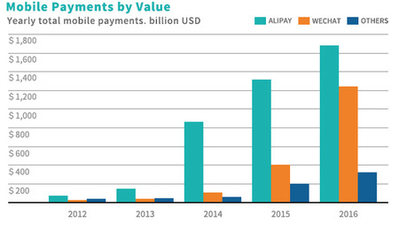 中国を例に見てみると、2016年のモバイル決済額が約627兆円に達したと英紙「フィナンシャル・タイムズ」が報じている。